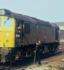 On the 29th March D25 (45021) heads towards Walsall with a coal train through the closed Wednesbury Town station whilst 25142 stands in distance. There, one of the local railway workers chats to the driver of the class 25 whilst it waits at a signal. |