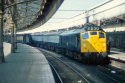 | Later on that day, (L) 25079 works into Aberdeen station from the south with a freight train whilst (R) 25066, freshly refuelled, waits in the station to depart with a southbound mail train. |