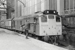 Having coupled 25057 onto the 1240 to Carlisle Glasgow's Shunter first looks back to see the Guard carry out the brake test and then chats to the Driver prior to the train's departure on the 6th March. |