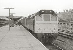 25298 (front) and 25322 prepare to depart Shrewsbury with the 08.45 Birmingham - Aberystwyth train on the 5th September. On the same day 25182 (front) and 25083 arrive at Aberystwyth with a special train from Euston. In the background can be seen the stock off the regular Birmingham - Aberystwyth train.
