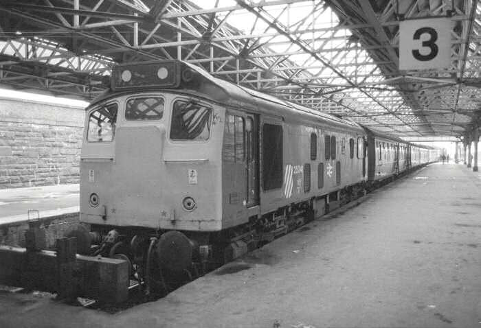 25241 stands at the buffers in Dundee station having brought in the 12.44 Glasgow Queen Street - Dundee service. At the far end an 08 shunter drops onto the stock to release the 25 so that it can work the return service. This would be the 15.39 Dundee - Glasgow and is believed to be the last passenger train worked by this loco. |