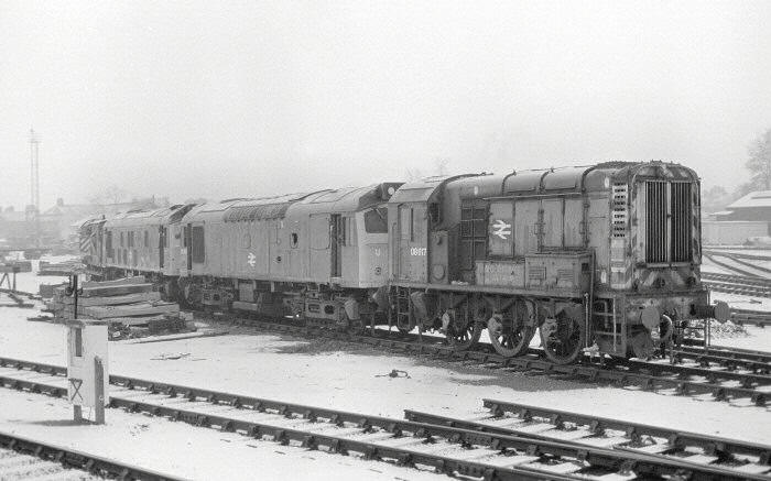 Gloucester Yard hosts a number of locomotives in the snow en-route to Swindon Works for scrapping. Seen here from left to right are 25071 (withdrawn 21/6/81), 25292 (w/d 18/10/81) and 08617 (w/d 12/10/81).