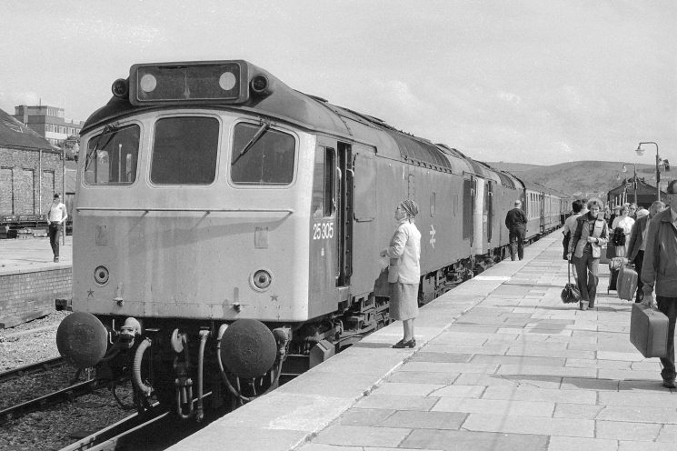 25305 and 25194 (far) with the 1010 Euston - Aberystwyth. It was sometimes forgotten by bashers that these trains ran for the benefit of the real holidaymakers that can be seen streaming away from the train. |